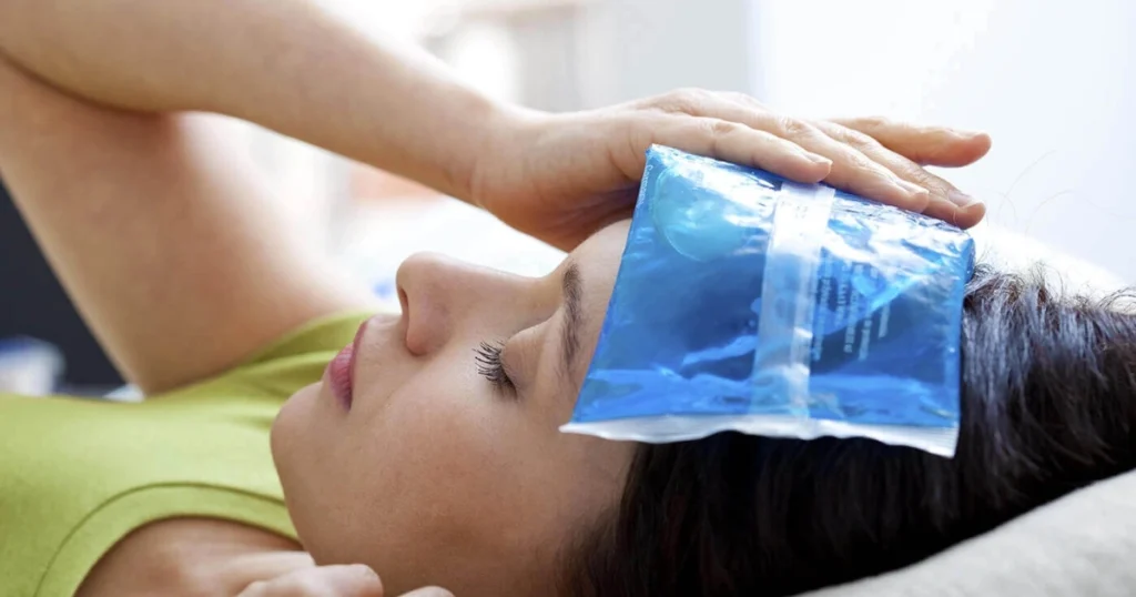 Pode ser uma compressa de gelo envolta num pano ou uma toalha molhada com água fria. O frio contrai os vasos sanguíneos da região, reduzindo a pressão craniana. - Relaxe e respire profundamente.