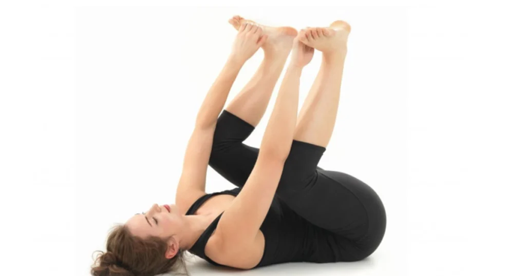 A Ananda Balasana é uma postura realizada deitado de costas, onde as pernas são elevadas e seguradas com as mãos. O objetivo é abrir suavemente os quadris, alongar a coluna e promover relaxamento profundo.