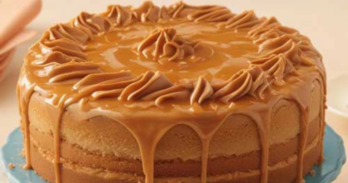 - Coloque a primeira camada de bolo em um prato de servir e espalhe uma generosa quantidade de doce de leite cremoso sobre ela.