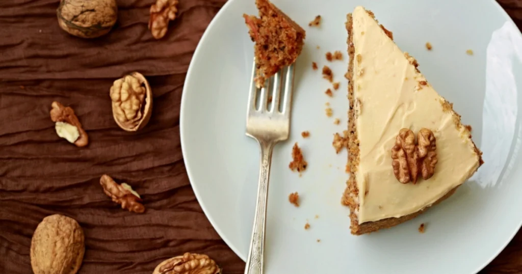 - Finalize o bolo decorando com nozes inteiras e picadas, espalhando-as delicadamente sobre o doce de leite.