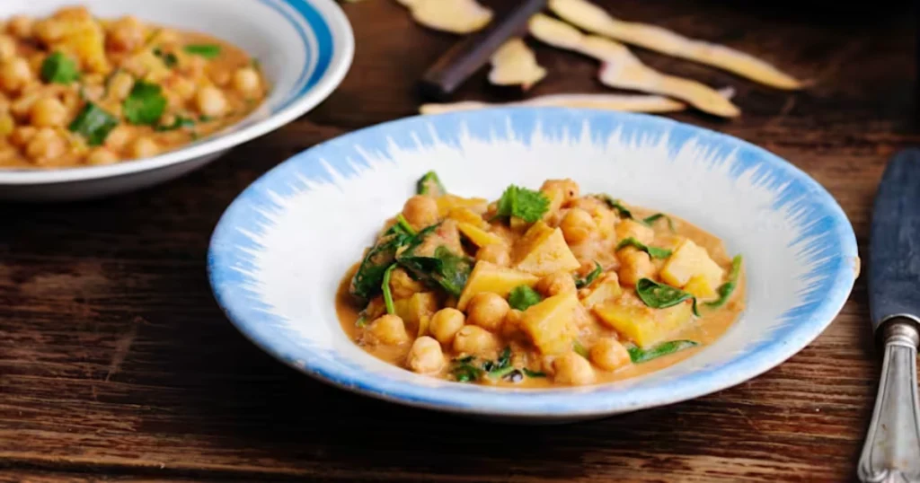 O caril de batata-doce, grão-de-bico e espinafres é uma refeição nutritiva, cremosa e cheia de aromas exóticos. Além de ser uma opção 100% vegana e sem glúten, esta receita combina a doçura natural da batata-doce com o toque leve dos espinafres e o sabor encorpado do leite de coco. É um prato reconfortante e equilibrado, ideal para o almoço ou jantar, com ingredientes simples e acessíveis.