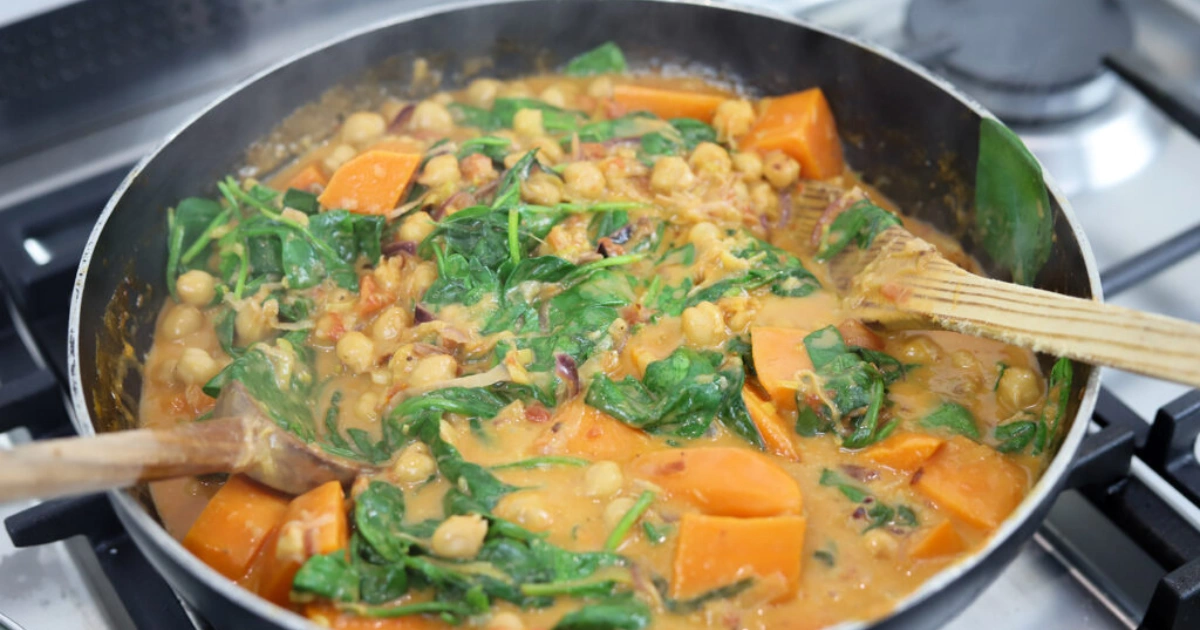O caril de batata-doce, grão-de-bico e espinafres é uma refeição nutritiva, cremosa e cheia de aromas exóticos. Além de ser uma opção 100% vegana e sem glúten, esta receita combina a doçura natural da batata-doce com o toque leve dos espinafres e o sabor encorpado do leite de coco. É um prato reconfortante e equilibrado, ideal para o almoço ou jantar, com ingredientes simples e acessíveis.