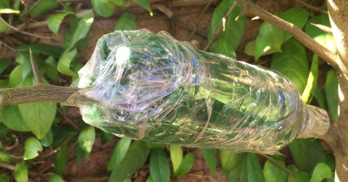 A utilização de uma garrafa plástica cria um miniambiente que mantém humidade constante, facilitando o desenvolvimento das raízes.