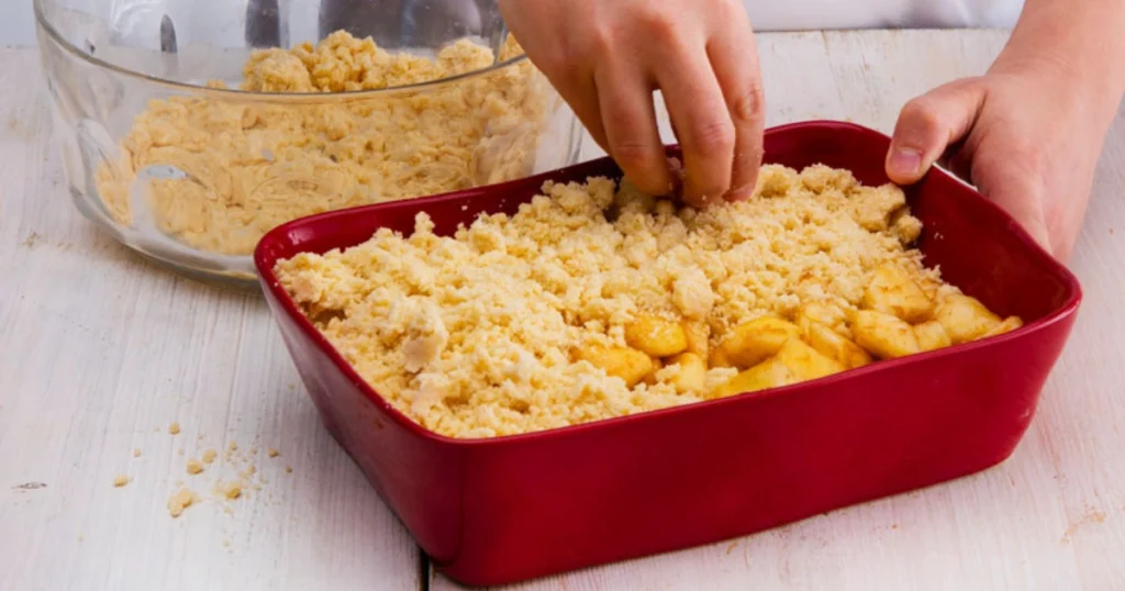 Transfira a mistura para um tabuleiro de aproximadamente 20 x 30 cm, espalhando de modo uniforme. Esta base será responsável por trazer doçura e maciez ao crumble de maçã.