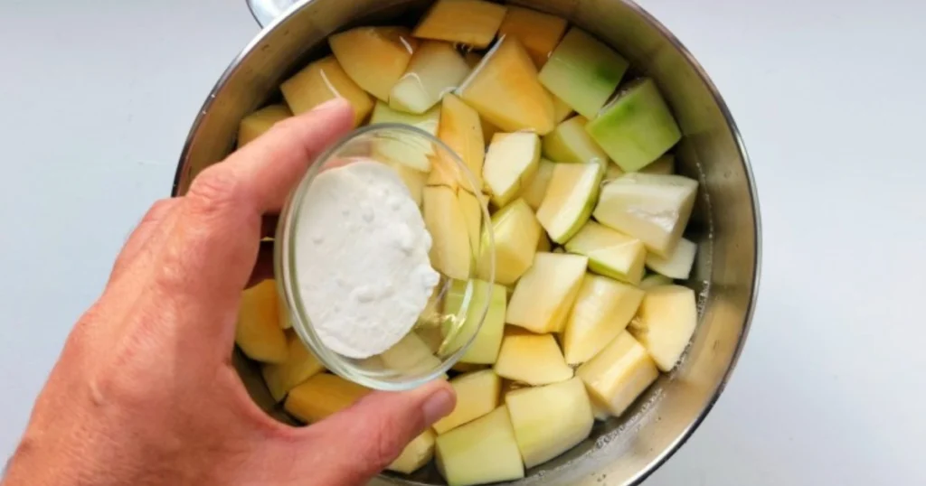 Coloque os pedaços de mamão numa tigela com água e adicione o pó royal ou bicarbonato. Este processo tradicional ajuda a deixar os pedaços mais firmes, garantindo que mantenham a forma durante o cozimento. Deixe repousar por alguns minutos.