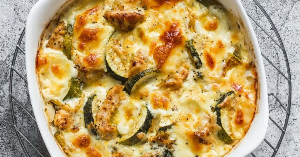 Este gratinado de courgettes com frango e arroz é uma receita prática, equilibrada e cheia de sabor. Ideal para aproveitar sobras de frango e transformar ingredientes simples num prato reconfortante, com aquele toque dourado irresistível do queijo gratinado.