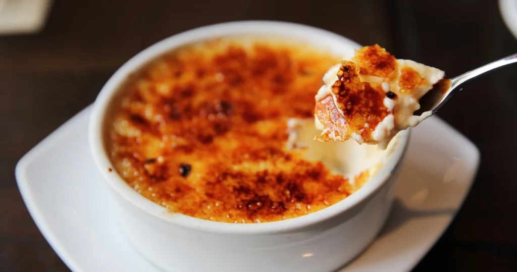 Antes de servir, polvilhe o topo com açúcar branco e queime com um ferro próprio ou maçarico de cozinha, até formar uma crosta dourada e estaladiça.