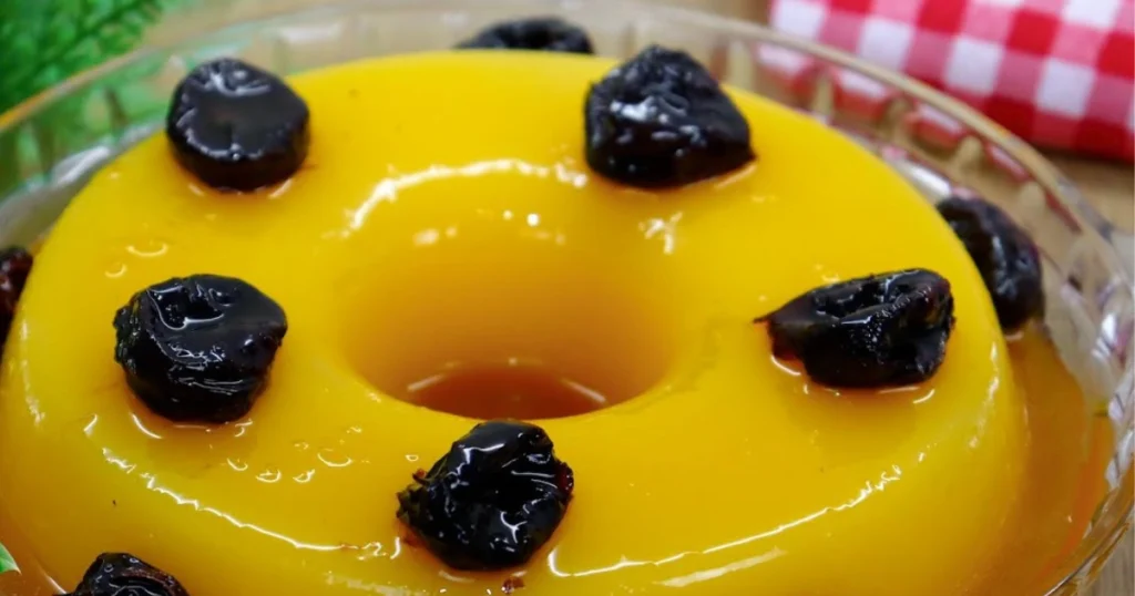 A combinação das duas camadas cria contraste de textura e sabor, com o frescor da calda equilibrando a cremosidade do manjar.