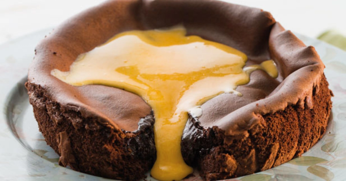 Deixe arrefecer alguns minutos, desenforme e coloque no prato de servir. Espalhe generosamente o creme de ovos por cima, criando um contraste perfeito entre o doce e o amargo do cacau.
