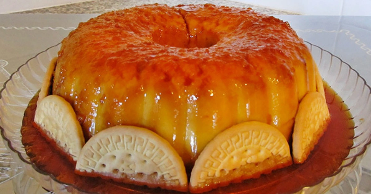 Unte uma forma de pudim (cerca de 22 cm de diâmetro) com o caramelo líquido, cobrindo toda a superfície interna. Despeje o creme ainda quente na forma e, em seguida, disponha as 7 bolachas Maria restantes inteiras sobre o topo — elas criarão uma camada especial de textura ao desenformar.