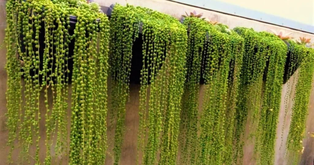 Uma das suculentas penduradas mais famosas, o Senecio rowleyanus chama atenção pelo formato esférico de suas folhas, que se assemelham a pequenas pérolas. Quando cultivado em vasos altos ou suspensos, cria longos fios verdes que podem ultrapassar a altura do próprio vaso.